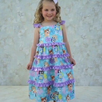 Let the joy of playtime come to life with this vibrant Bluey & Bingo tiered dress. Crafted in a soft, breathable cotton blend, the light blue base sets the stage for a cascade of purple ruffles that twirl with every step. Adorned with cheerful prints of Bluey, Bingo, balloons, and florals, this dress captures the whimsy and wonder of childhood. A light purple hair bow completes the look, making it perfect for birthdays, park adventures, or everyday magic. Designed for comfort and charm, this dress is a favorite among little fans of the beloved animated series.